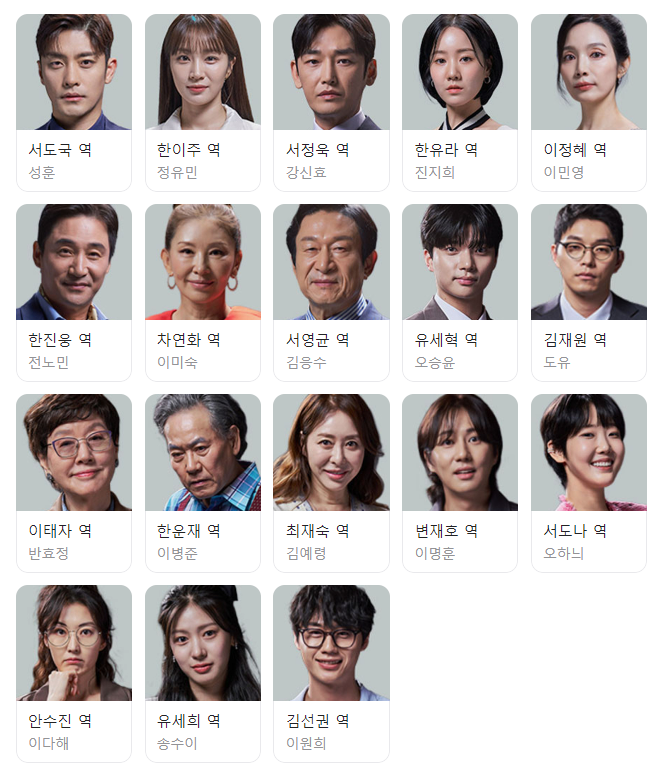서도국과 한이주, 서정욱과 한유라를 중심으로 복잡한 인물 관계도를 그리고 있습니다. 이 복잡한 인물 관계도에서 어떠한 스토리가 그려질지 기대가 됩니다.